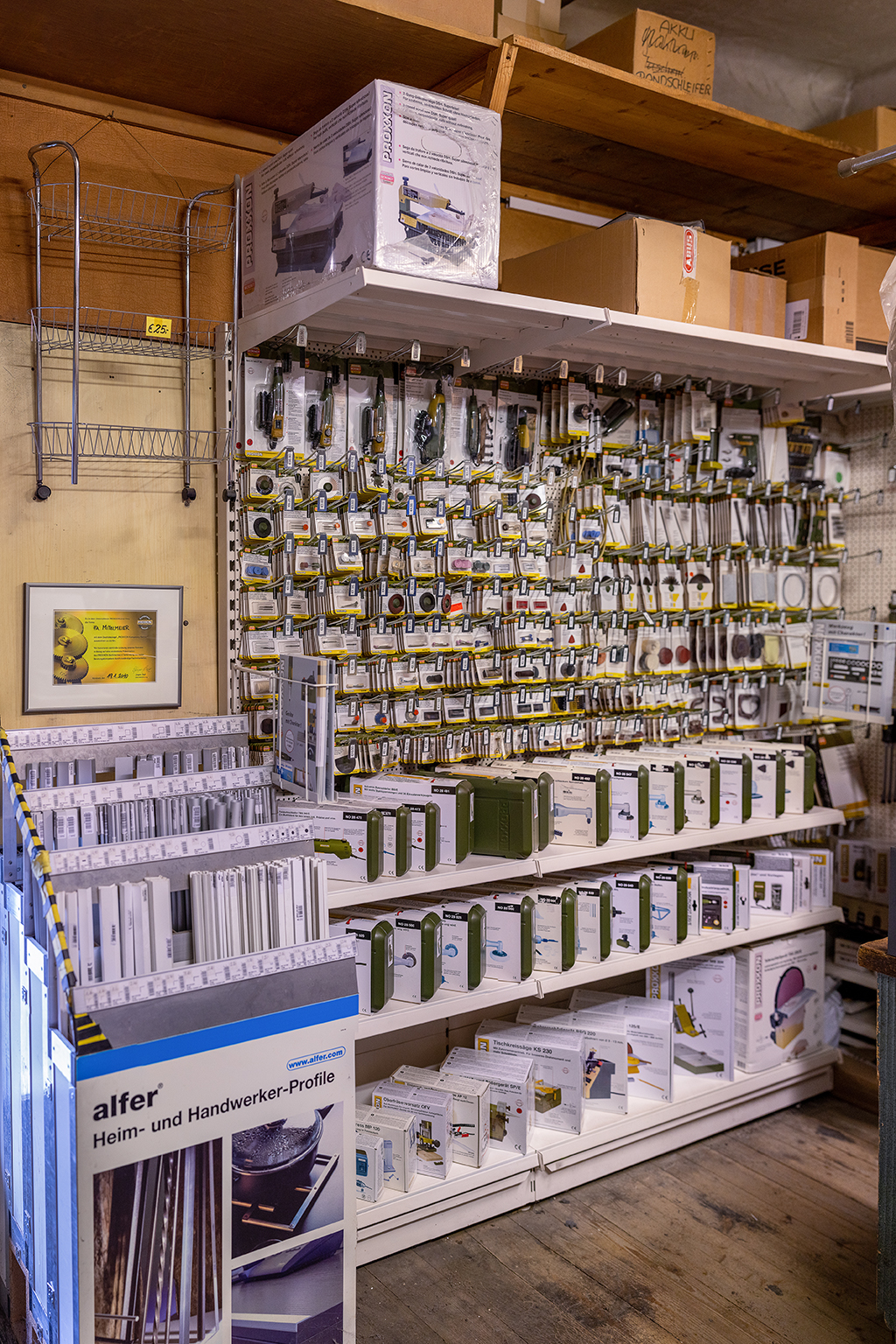 Wenn Sie noch eine wirklich alte Eisenhandlung suchen, sind Sie bei uns richtig. Unser Warenangebot umfasst neben den bekannten Artikeln wie Nägel, Schrauben, Dübeln und sonstige Kleineisenwaren die stückweise verkauft werden noch eine Vielzahl an Produkten wie Blumenerde, Blumentöpfe, Übertöpfe, Emailgeschirr, Einkochgläser, Farben und Lacke, Gartenzwerge, Haushaltsartikel, Klebstoffe, Metalle, Modellbauwerkzeuge & Zubehör sowie den Maschinenverleih zur Teppichreinigung und diverse Drogerieartikel.